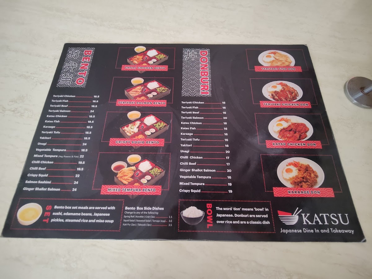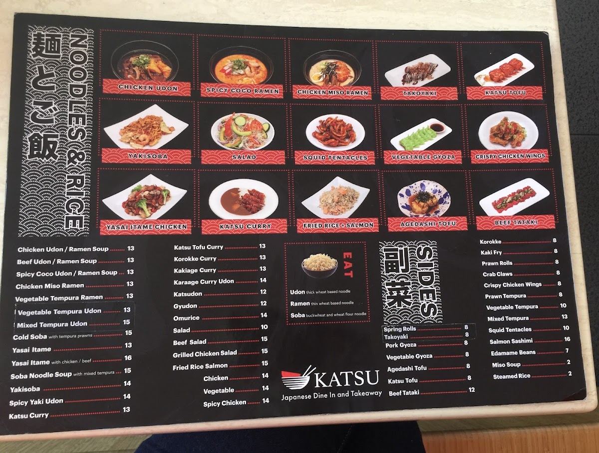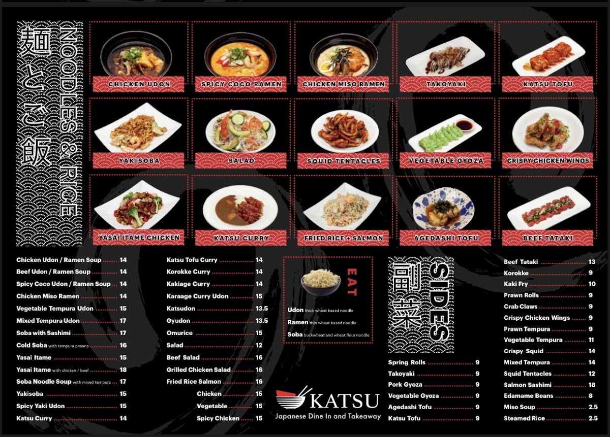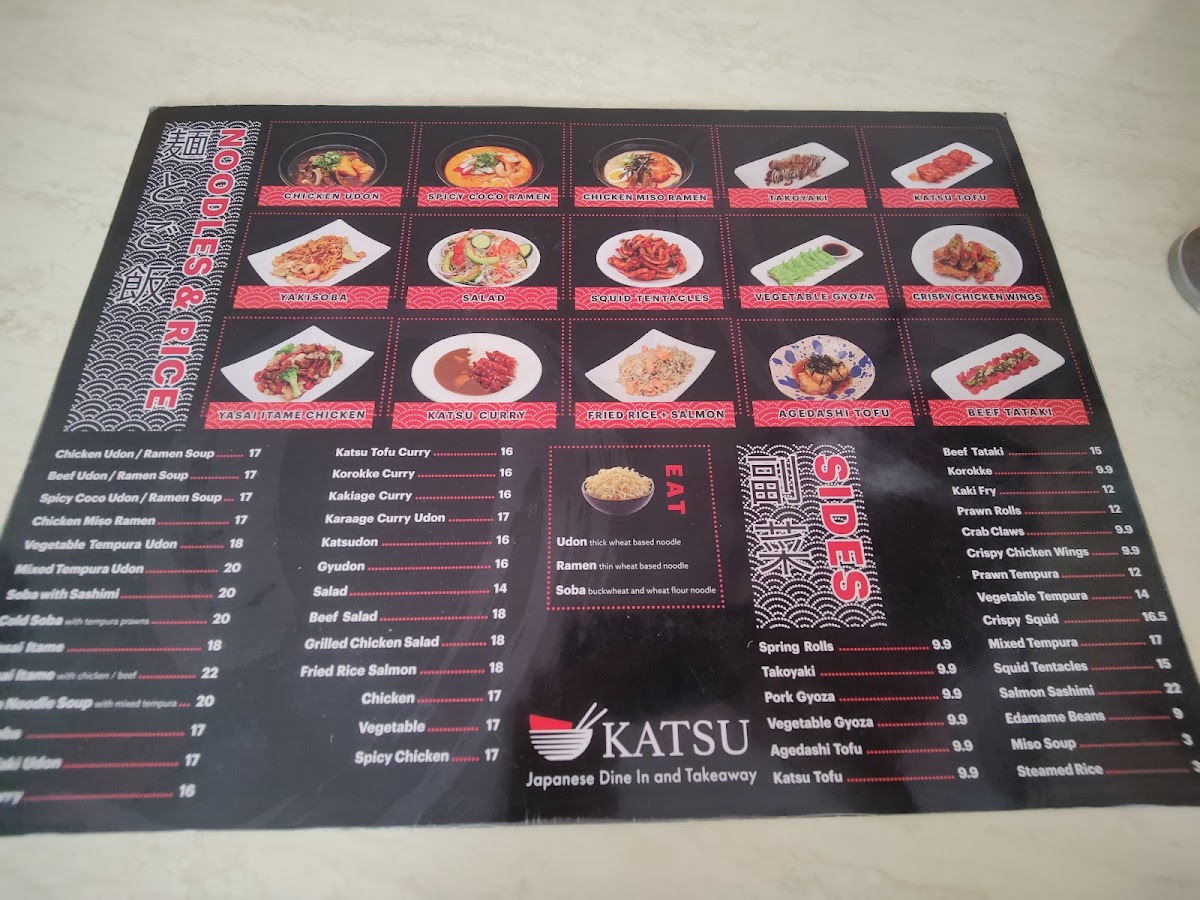 From a reviewer's perspective, the menu at Katsu Japanese Midland offers a broad spectrum of classic Japanese dishes with a focus on both comfort and variety. For starters, the Sides section features crowd-pleasers like Spring Rolls, Takoyaki, Pork Gyoza, Vegetable Gyoza, and Agedashi Tofu, perfect for sharing or nibbling before a main meal. The Donburi options are equally inviting, with choices such as Teriyaki Chicken, Teriyaki Fish, Teriyaki Beef, Teriyaki Salmon, and Katsu Chicken, each served over rice for a satisfying combination of flavors. Noodle lovers will appreciate the 湯麵 section, which includes Chicken Miso Ramen, Yakisoba, Squid Tentacles, Vegetable Gyoza, Yasai Itame Chicken, and more, highlighting both hearty broths and stir-fried options. The 麺とご飯, Noodles & Rice offerings extend this variety with Chicken Udon / Ramen Soup, Beef Udon / Ramen Soup, Spicy Coco Udon / Ramen Soup, Chicken Miso Ramen, and Vegetable Tempura Ramen, ensuring that every palate can find something warming and satisfying. Additionally, dishes like Spicy Yaki Udon and Katsu Curry provide flavorful, spiced alternatives for those seeking a little extra kick. Overall, the menu at Katsu Japanese Midland demonstrates a thoughtful balance between traditional Japanese staples and comforting, customizable noodle and rice dishes, making it a reliable spot for both casual lunches and more indulgent dinners.