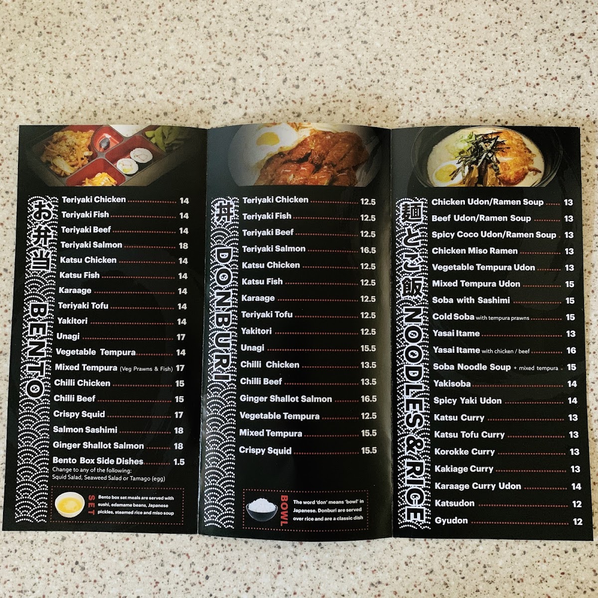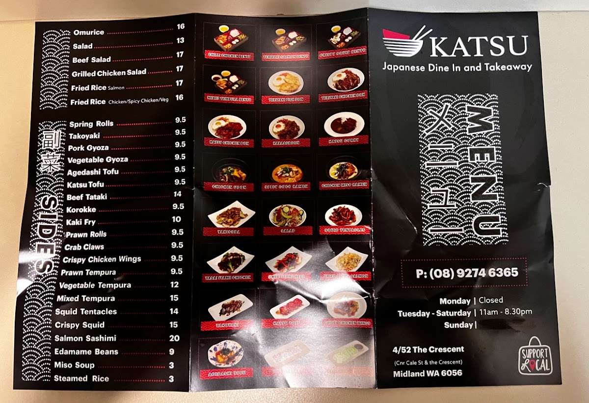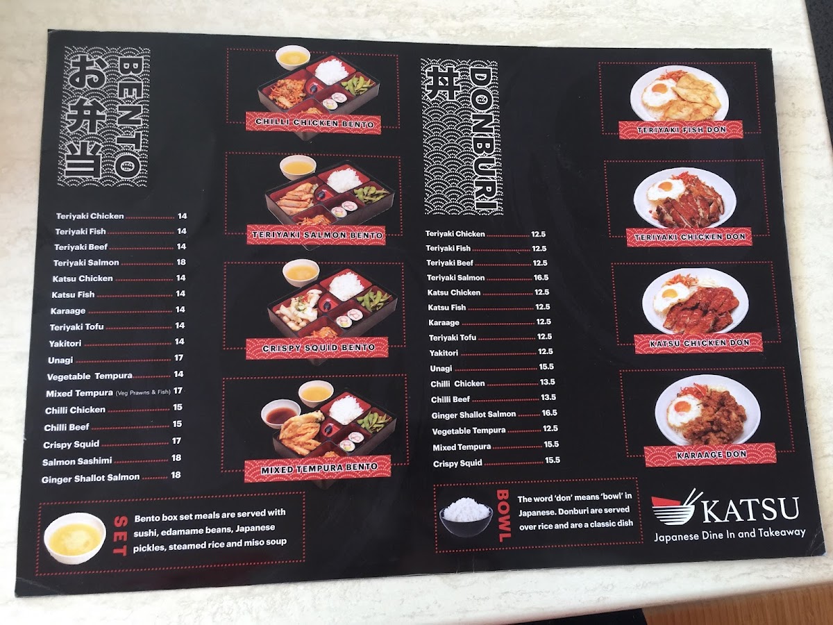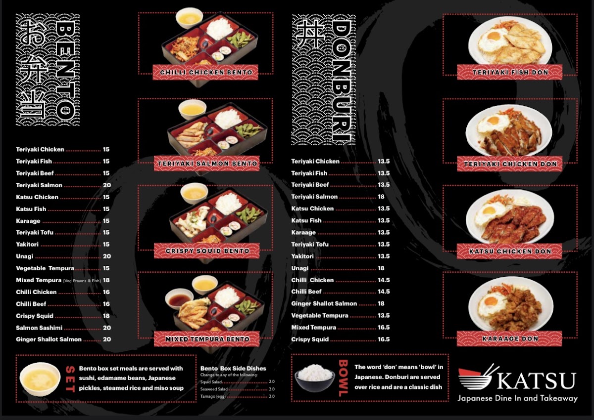 From a reviewer's perspective, the menu at Katsu Japanese Midland offers a broad spectrum of classic Japanese dishes with a focus on both comfort and variety. For starters, the Sides section features crowd-pleasers like Spring Rolls, Takoyaki, Pork Gyoza, Vegetable Gyoza, and Agedashi Tofu, perfect for sharing or nibbling before a main meal. The Donburi options are equally inviting, with choices such as Teriyaki Chicken, Teriyaki Fish, Teriyaki Beef, Teriyaki Salmon, and Katsu Chicken, each served over rice for a satisfying combination of flavors. Noodle lovers will appreciate the 湯麵 section, which includes Chicken Miso Ramen, Yakisoba, Squid Tentacles, Vegetable Gyoza, Yasai Itame Chicken, and more, highlighting both hearty broths and stir-fried options. The 麺とご飯, Noodles & Rice offerings extend this variety with Chicken Udon / Ramen Soup, Beef Udon / Ramen Soup, Spicy Coco Udon / Ramen Soup, Chicken Miso Ramen, and Vegetable Tempura Ramen, ensuring that every palate can find something warming and satisfying. Additionally, dishes like Spicy Yaki Udon and Katsu Curry provide flavorful, spiced alternatives for those seeking a little extra kick. Overall, the menu at Katsu Japanese Midland demonstrates a thoughtful balance between traditional Japanese staples and comforting, customizable noodle and rice dishes, making it a reliable spot for both casual lunches and more indulgent dinners.